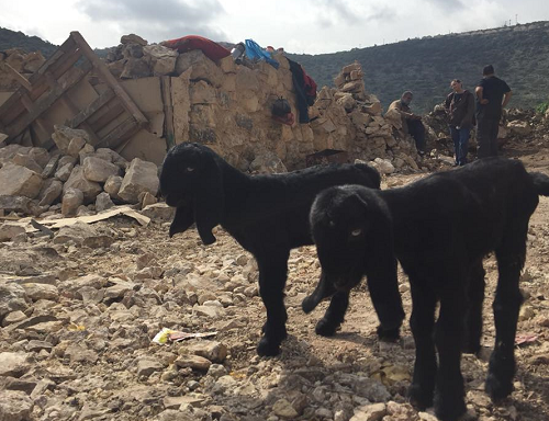 Note: some days after the interview, the house of Rezeq Abu Nasser was destroyed by the IDF. The mother sheep that gave birth to twins on the day of the interview (photo previous page) was killed. The orphans, with the demolished house in the background, are on the photo to the right. |